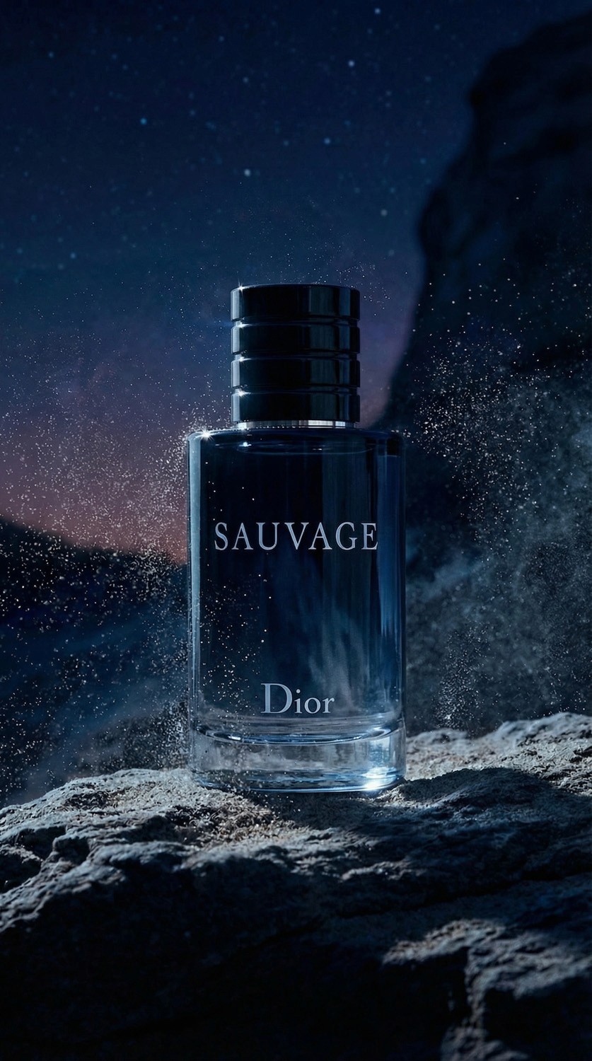 Moving away from the traditional daylight of desert campaigns, this concept dives into the depths of a starlit night. The narrative places the iconic Sauvage bottle in a vast, nocturnal landscape, illuminated solely by celestial light. The visual direction focuses on the magnetic tension between the cold, rugged environment and the product, validating a more mysterious and cinematic mood for the brand’s storytelling.