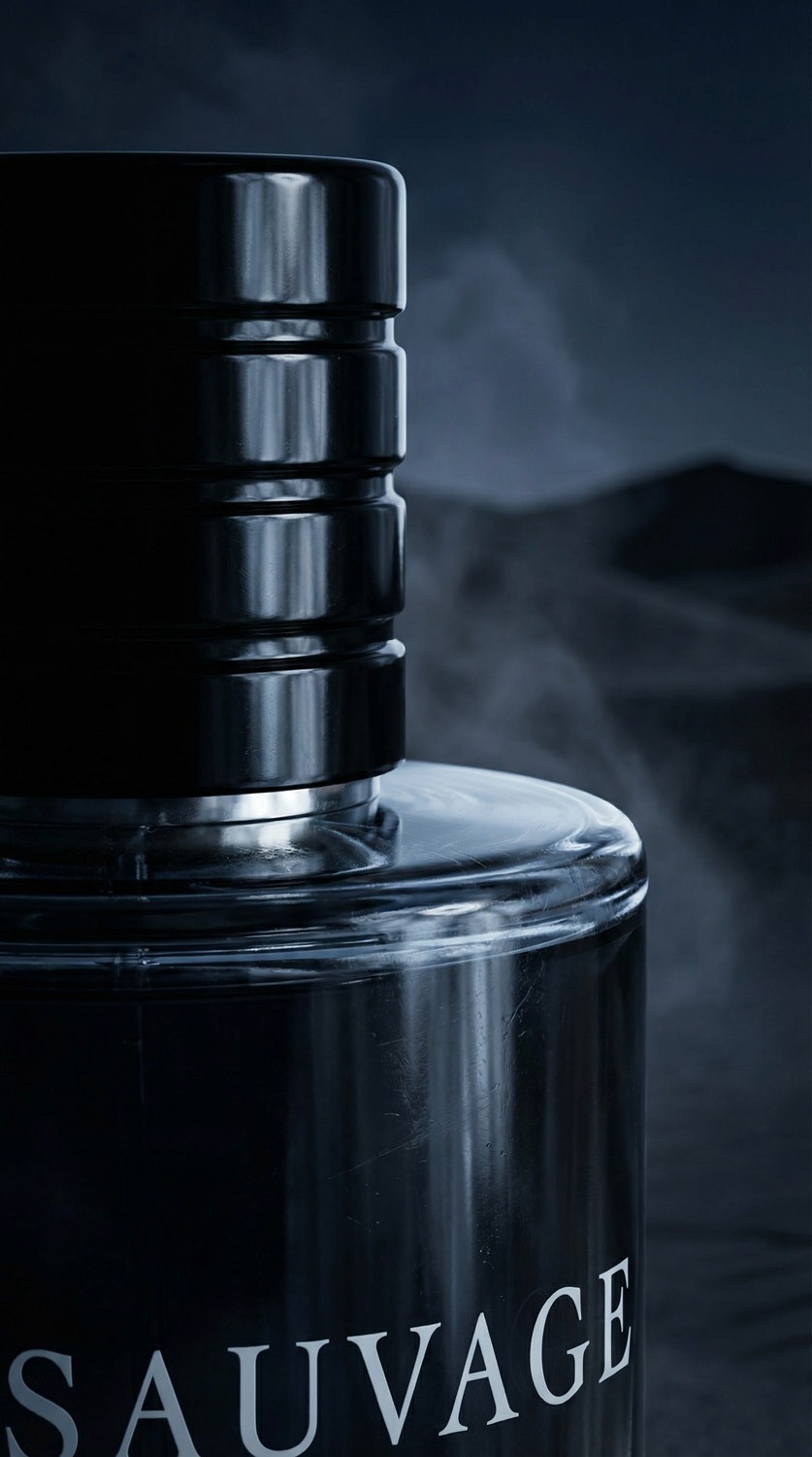 A study of chiaroscuro and atmospheric density. The aesthetic is defined by the deep midnight-blue gradient of the bottle dissolving into the desert shadows. Special attention was given to the precision of "invisible" details—suspended dust particles catching the moonlight and the sharp, metallic reflections of the cap. It creates a sensory experience that feels silent, yet electric.